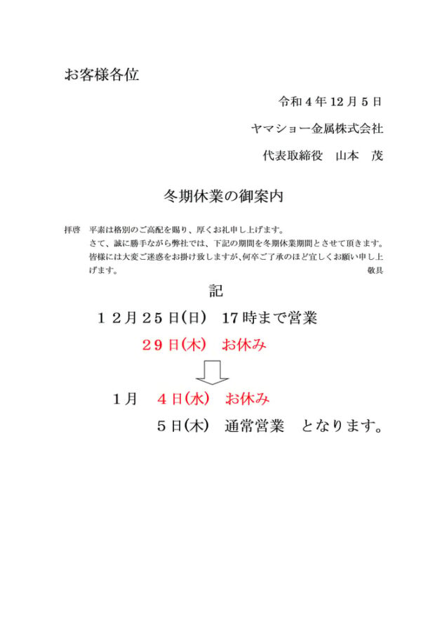 年末年始休業のご案内