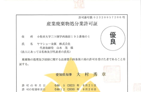 産業廃棄物処分業許可証の優良認定を取得しました。