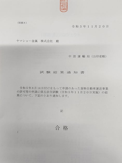 貨物自動車運送事業『法令試験の結果通知書』